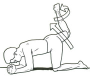 In Knie-Ellbogenlage rechtes Bein im Knie gebeugt, Unterschenkel ausgedreht, Sprunggelenk gebeugt, Bein anheben.
