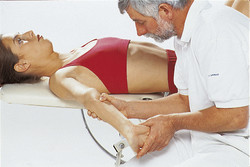 a) In Rückenlage des Patienten mit gebeugtem Ellbogengelenk, ausgedrehtem Unterarm und überstrecktem Handgelenk erfolgt Druck des Daumens zu u-förmiger Vorspannung der Unterarmbeuger.